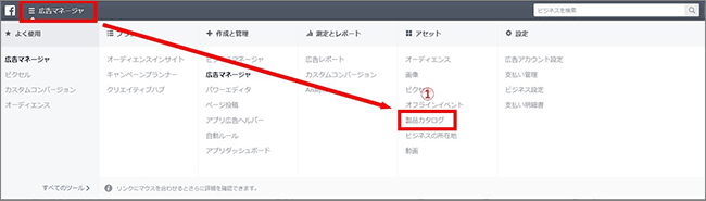 ①まず、広告マネージャーより「製品カタログ」を開きます。