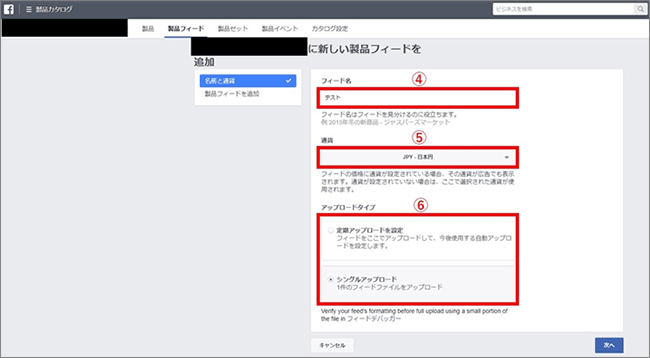 ④にはフィード名を入力し、⑤では通貨を選択します。⑥アップロードタイプで「シングルアップロード」を選択します