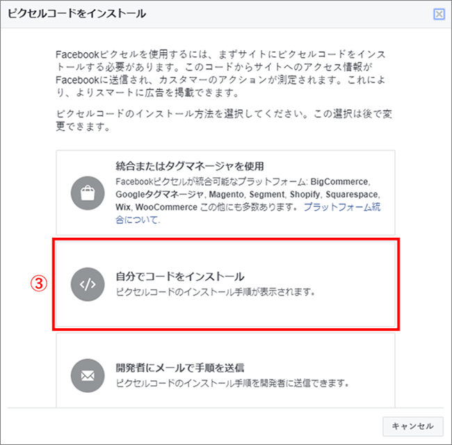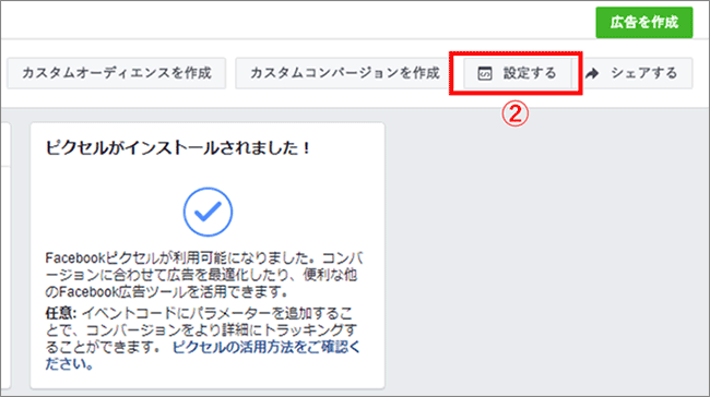 まず、カスタマイズするイベントコードを用意します。①広告マネージャーより「ピクセル」をクリックします。