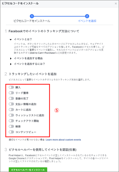 ⑤トラッキングしたいイベントを選択すると、対応したコードをカスタマイズする事ができます。今回カスタマイズが必要となる対象のイベントコードは「コンテンツビュー」「カートに追加」「購入」になります。