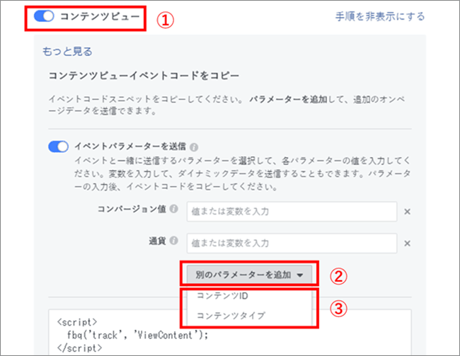 ①「コンテンツビュー」をクリックしたら、続いて②「別のパラメーターを追加」をクリックし、さらに③「コンテンツID」をクリックします。②と③を繰り返し「コンテンツタイプ」もクリックします。