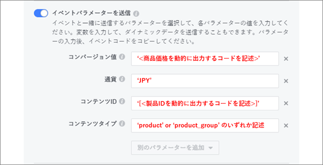 また、イベントパラメータの記述内容も商品詳細ページと同様になりますが、「コンバージョン値」と「コンテンツID」欄については下記を考慮する必要があります。