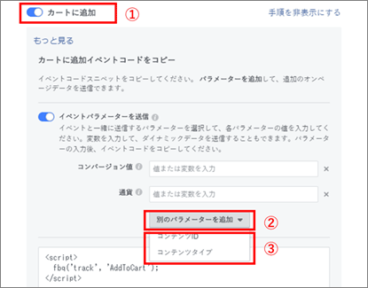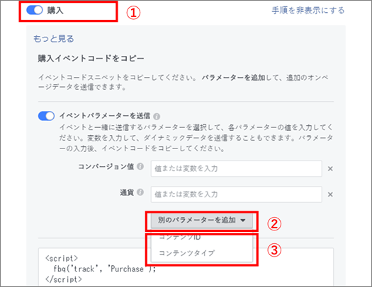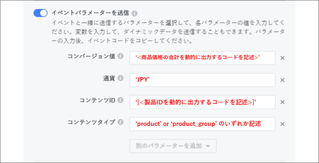 イベントパラメータの記述内容も「カートページ」同様で、「コンバージョン値」欄にはカートに入れられた商品の合計価格、複数の製品IDがカートに含まれていた場合の「コンテンツID」はカンマ「,」で区切る必要があります。
