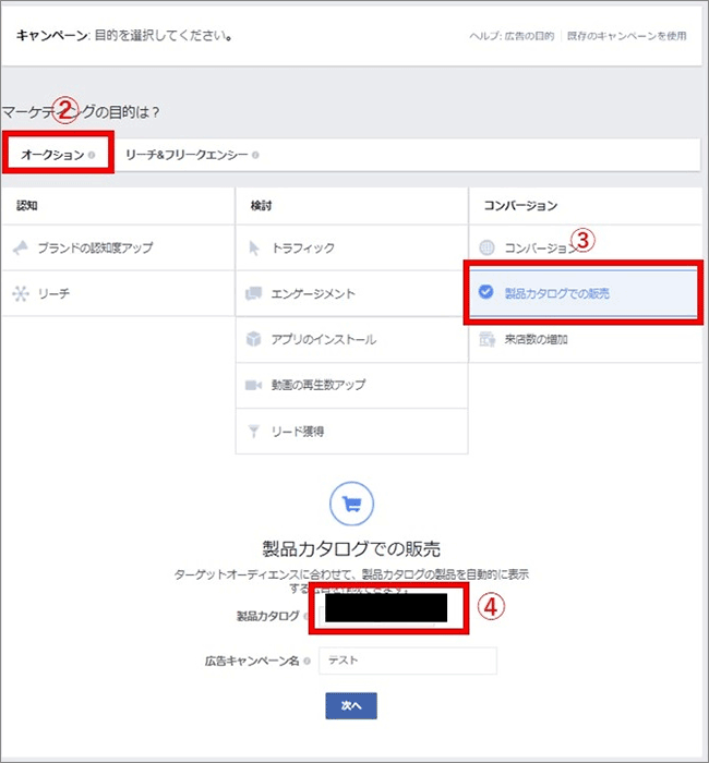 ②「オークション」を選択し、③マーケティングの目的は「売上」を選択しカタログ設定をONに変更、④作成した製品カタログを選択し、キャンペーンを入力したら「次へ」をクリックします。