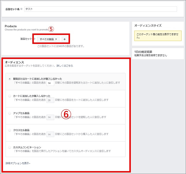 ⑤製品セットより「すべての製品」または、作成済みの製品セットがあれば、どちらかを選択します。続いて⑥任意のオーディエンスを選択します。