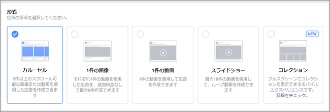 ただし「売上」を目的としてカタログ設定をONにしたキャンペーンでは「画像形式」「カルーセル形式」でダイナミック広告を作成できるのに対して、その他の目的を設定したキャンペーンでは「カルーセル形式」でしかダイナミック広告を作成できないので注意してください。