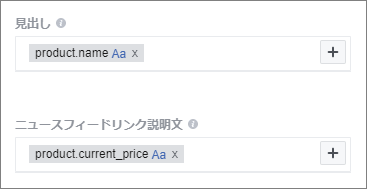 あとは通常のリンク広告の作成手順と同じですが、ダイナミック広告を作成する場合、上図の「+」マークより製品情報の変数を追加することで「見出し」や「ニュースフィードリンク説明文」へ製品フィードの情報を反映することができます。自動生成される製品画像の製品名や価格を自動表示してくれるため、是非設定しておきたい項目です。