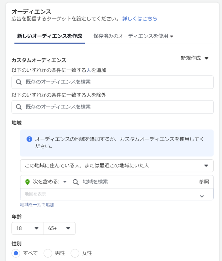 キャンペーンの設定を行った後は広告セットの設定にて配信オーディエンスの選択ができるため、目的に合わせて地域、年齢、性別の設定を行います。