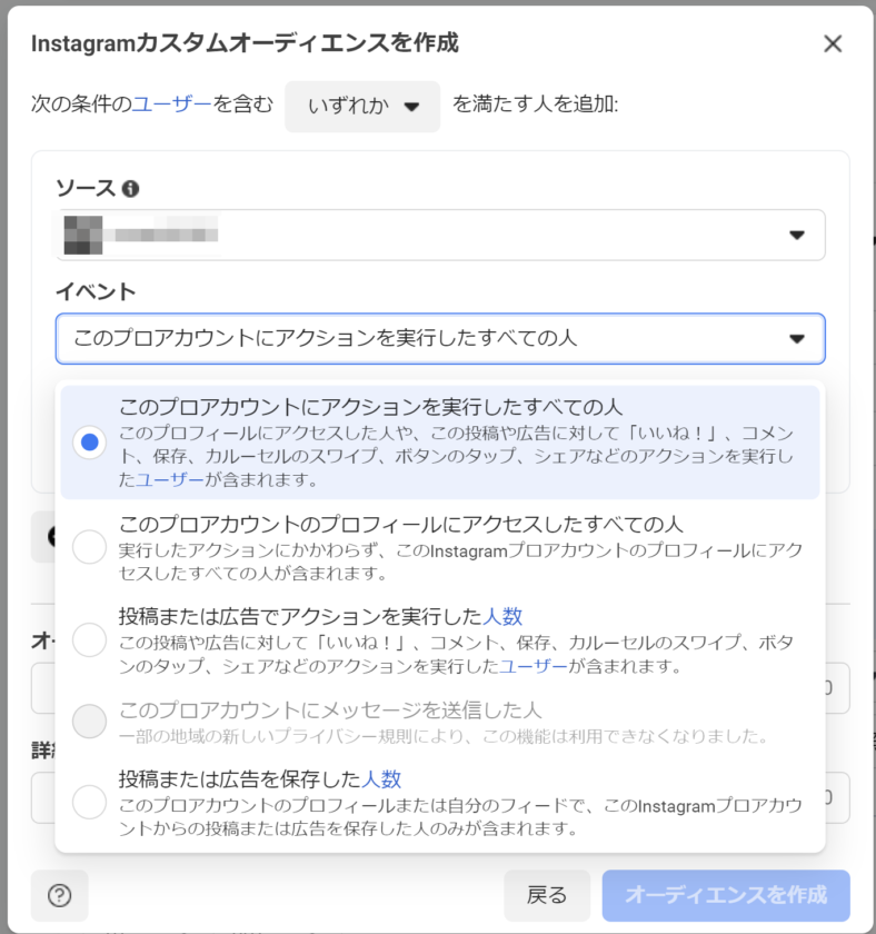 ②オーディエンスのソースで「Instagramアカウント」を選択