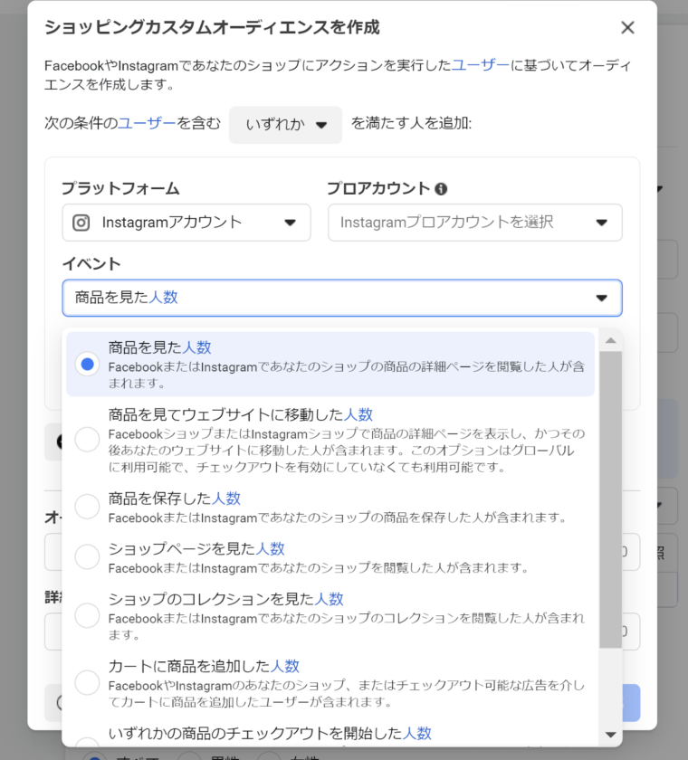 オーディエンス例②|Instagramショッピングでユーザーアクションをしたユーザー