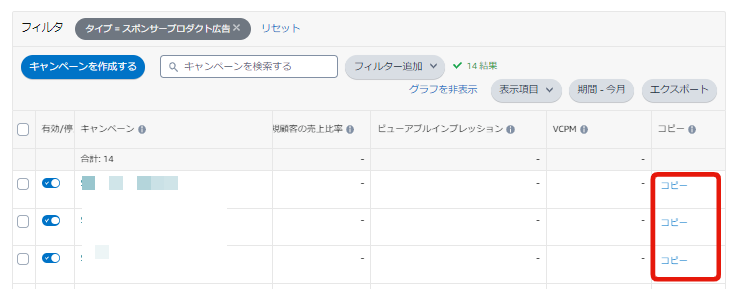 1.キャンペーンマネージャーで、コピーしたいキャンペーンの「コピー」列をクリックします。