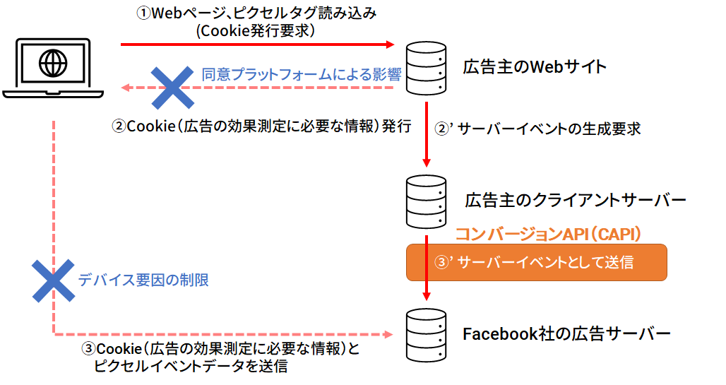Cookieの制限が強化されていくにつれ、コンバージョンの計測漏れ(欠損)の割合が拡大していく事で機械学習を活用した自動入札が機能しづらくなり広告の費用対効果が下がる可能性がでてきました。この事象を回避するためCookieに依存しない計測方法のコンバージョンAPが以前より提供されていましたが、いよいよ導入の本格化が始まりました。