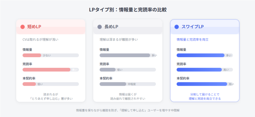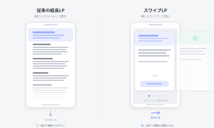 従来の縦長LPと比べたときの違いはシンプルで、一気に読ませず、1枚ずつ順番に理解させる構造になっています。読み飛ばしが起こりにくいのもポイントでしょう。