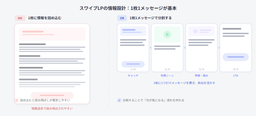 スワイプLPは、1枚に情報を詰め込むと途端に読まれにくくなります。基本は「1枚1メッセージ」。1枚で言いたいことは1つに絞り、テキストは短く、次の1枚が気になる流れを意識して設計します。