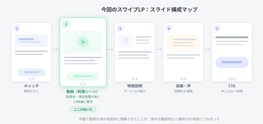 今回の事例では全10枚構成のうち、2枚目に利用シーンの動画を配置しました。この動画ページが成果改善に大きく寄与したと考えています。