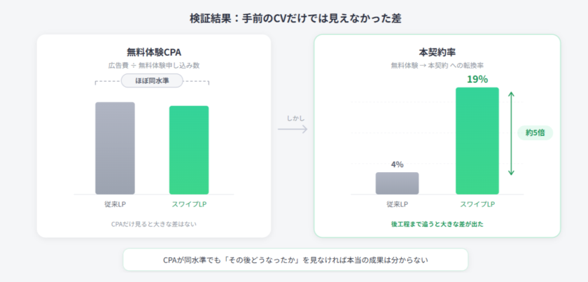 しかし、本契約(上位CV)まで追ったところ、結果が一変。従来LP 4%→スワイプLP 19%と本契約率に約5倍の差が出ています。