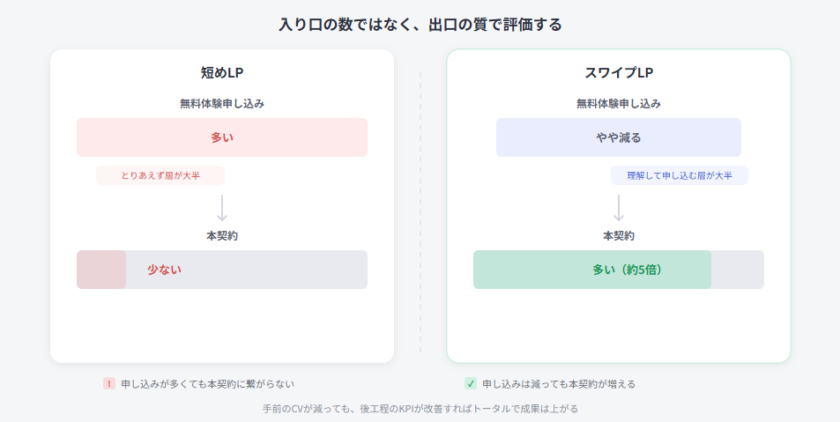 無料体験のCPAが同じでも、本契約まで追うと成果・評価が変わる。本契約まで計測することで初めてLPの本当の成果が見えるようになります。