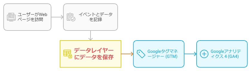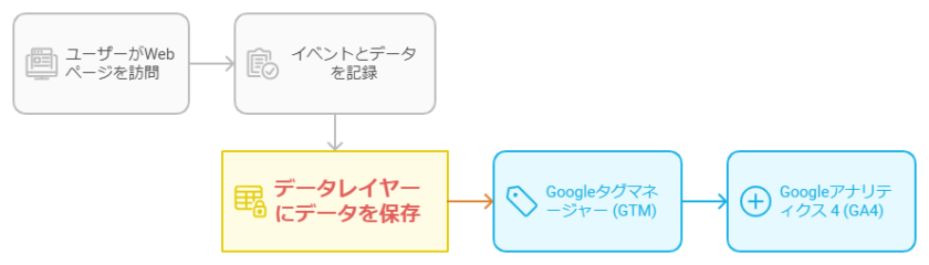 具体的には、ユーザーがWebページを閲覧した際に、そのページ上のさまざまなイベントやデータ(例:商品ID、購入金額、ユーザーの行動など)を記録し、これをGoogleタグマネージャー(GTM)などのタグ管理ツールが取得できるようにします。