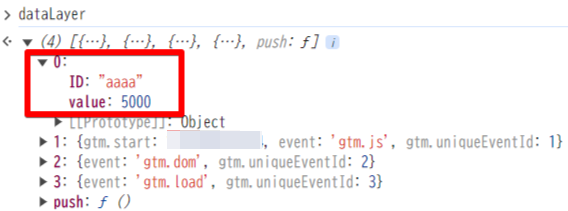 データレイヤーの中身は、「キー:値」の形で記述されています。このキャプチャだと、「ID」と「value」がキー、「”aaa”」と「5000」がそれぞれ対応する値です。このページの場合は、商品IDがaaa、商品の価格が5,000円です。