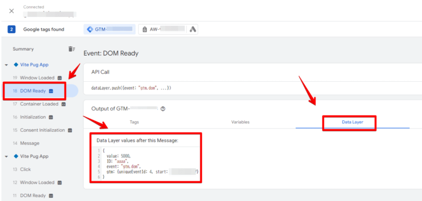 (例えば、データレイヤーを利用する予定の広告計測タグが「DOM Ready」で発火する設定になっている場合は、「DOM Ready」のログを確認しましょう)