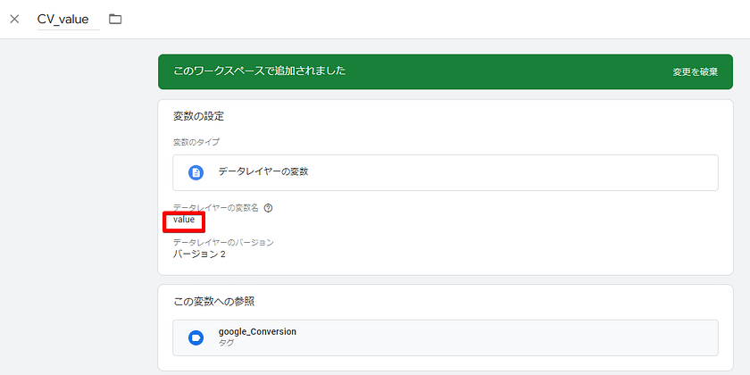 この例では、コンバージョンタグが発火する際にコンバージョン値(売り上げ価格)として変数「value」が送信されます。