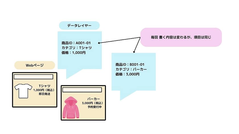 例えば、通販サイトの購入完了ページでは、購入した商品の商品ID、価格、購入したユーザーのユーザーIDといった情報を都度記録することになります。 Webサイトが表示されるときには、毎回ページの内容に従って、データレイヤーの内容が更新される設定にすることで、指定した項目の値を、ページ内容に応じて取得することが可能になります。