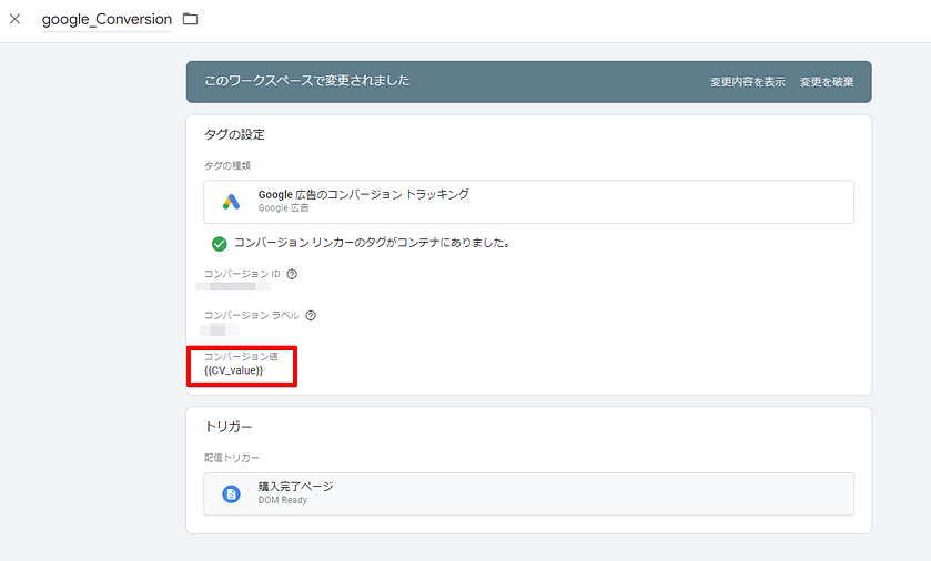 キャプチャはGoogle広告のコンバージョンタグに前述のデータレイヤー変数をセットした例です。