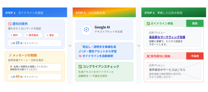 テキストに関するガイドラインは、Google広告のAI自動生成と広告主のブランドコントロールを両立させるための機能です。語句の除外で特定の表現をピンポイントで排除し、メッセージの制限でコンセプトやトーンを方向付けるという2つのアプローチを組み合わせて使います。