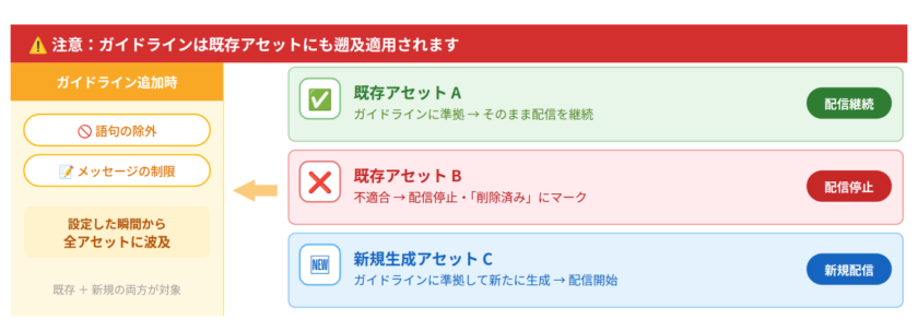 AIの出力が得られたら、設定前に以下を確認しましょう。制限が広範すぎないか(意図しないアセットまで大量削除されるリスク)、ターゲティングやROI目標に関する内容が混ざっていないか(テキストガイドラインでは機能しない)、そして既存の自動生成アセットへの影響範囲です。ガイドラインは既存アセットにも遡及適用されるため、現在配信中のアセットがどれだけ影響を受けるか事前に把握しておくことが重要です。