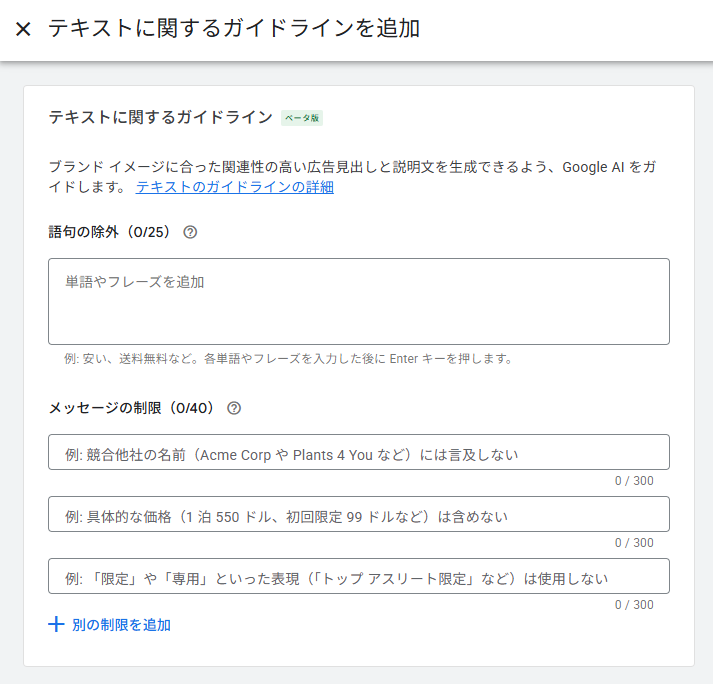 メッセージの制限は、語句の除外よりも広い概念レベルでの制御を行える機能です。テキストアセットで避けるべきコンセプト、関連付け、スタイル、そして遵守すべきトーンなどを自然言語で指定できます。キャンペーンあたり最大40個まで設定可能です。