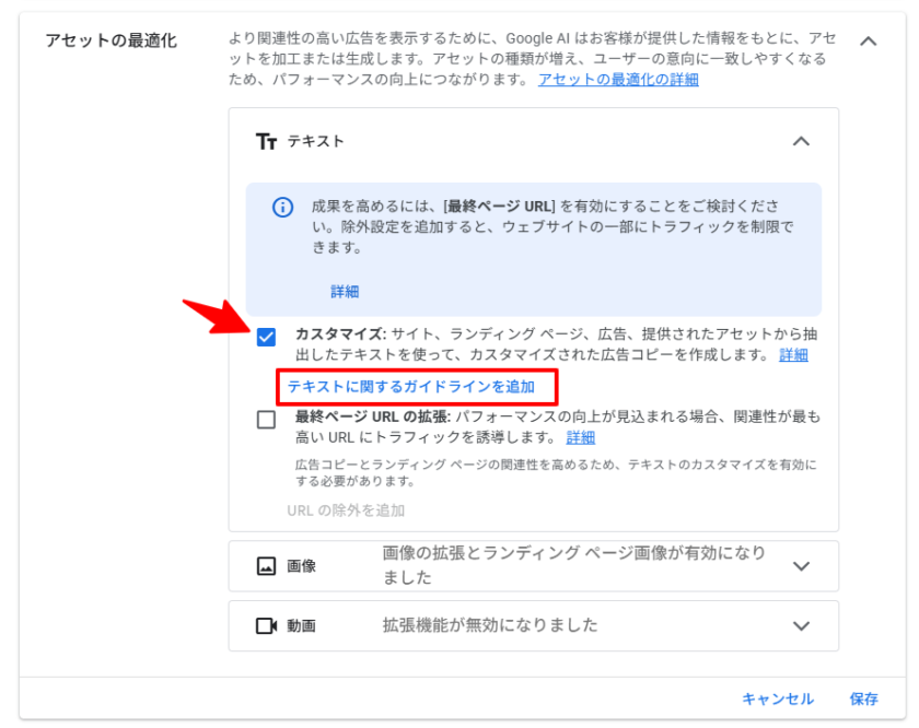 既存のP-MAXキャンペーンでは、キャンペーン設定の「アセットの最適解セクション」あるいは「ブランドガイドライン」からアクセスします。「アセットの最適解セクション」の場合の、テキストに関するガイドラインは、カスタマイズの下に配置されています。