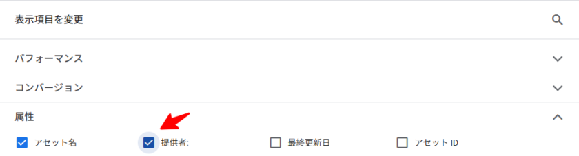 設定したガイドラインが正しく機能しているかは、アセットレポートで確認できます。確認方法はレポートで「提供者」列を追加し、「Google AI」でフィルタすると、AIが生成したアセットだけを一覧できます。