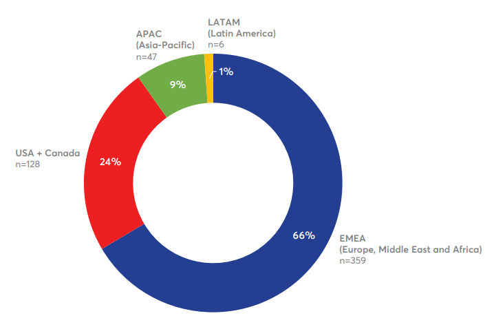 地域別のシェアでは、EMEA(欧州・中東・アフリカ)地域が66%と最も多く、その次に多いのは24%を占める米国・カナダとなっています。一方、APAC(アジア太平洋地域)は9%、中南米は1%にとどまりました。