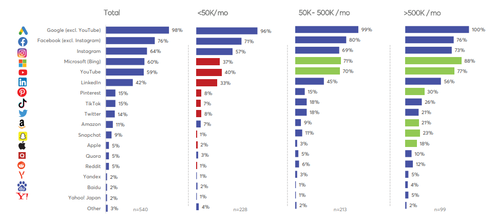 広告予算の月額が5万ドル(約630万円)以上の場合、MicrosoftやYouTubeをはじめ複数のチャネルがより大きなシェアを占めるようになります。また、月に50万ドル(約6,300万円)も超えると、全体的に媒体の数が増えるだけではなく、MicrosoftとYouTubeのシェアがFacebookを上回ることも興味深いです。