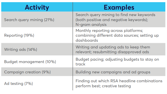 しかも、回答者が「自動化したいタスクは何か」という質問に対して、クエリーマイニング(21%)、レポーティング(19%)、予算管理(10%)という、サードパーティーツールで充分にカバーできそうなタスクを挙げているものの、利用率が低いのはまた興味深いことです。
