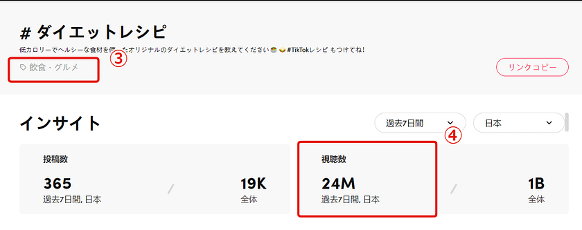 利用可能なハッシュタグは、過去7日間で10万件以上の視聴があった場合に限られます。TikTokクリエイティブセンターで、使用したいハッシュタグの視聴数を事前に確認してから施策に取り掛かると良いでしょう。