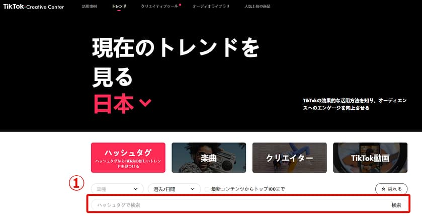①TikTokクリエイティブセンターにアクセスし、検索窓で任意のハッシュタグを検索。