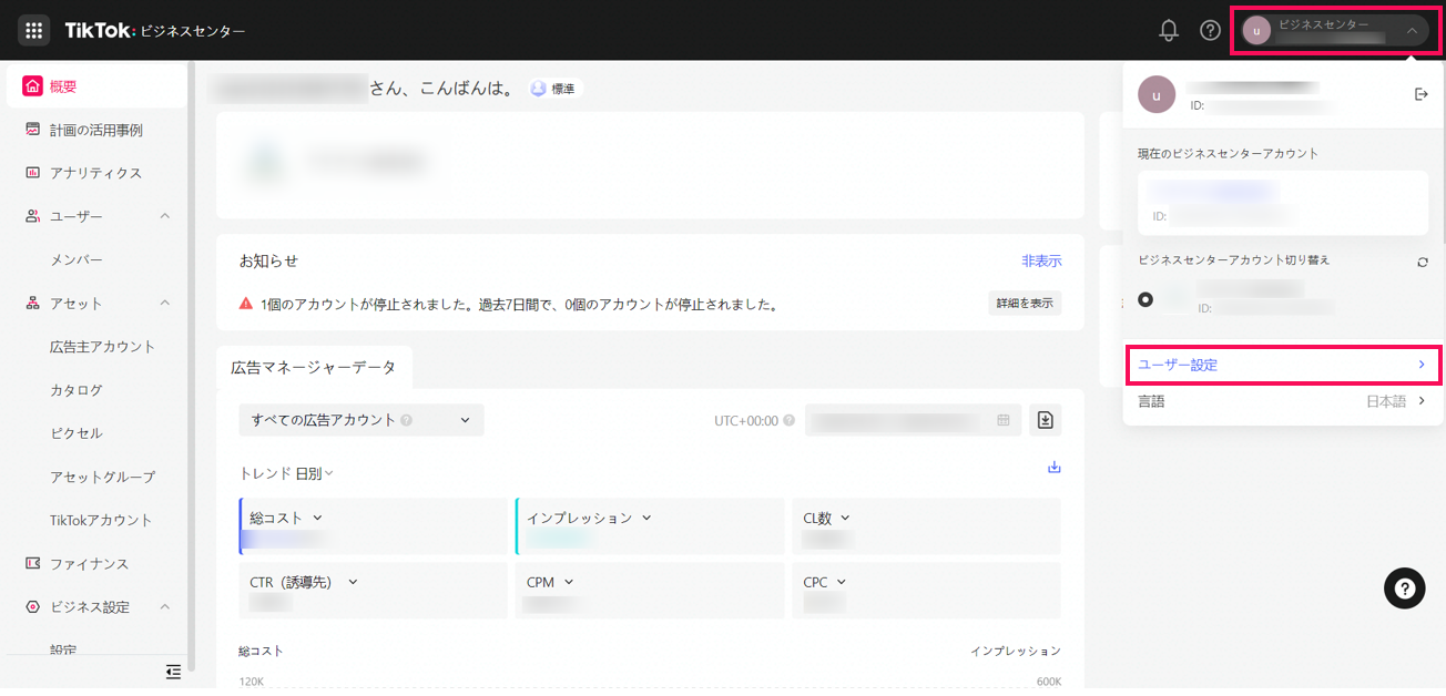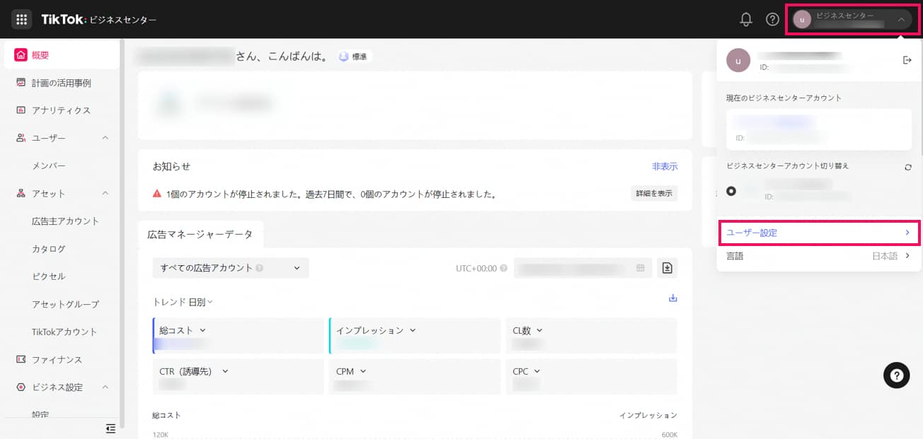 TikTokビジネスセンターにログインし、画面右上のアイコンから[ユーザー設定]をクリックします。