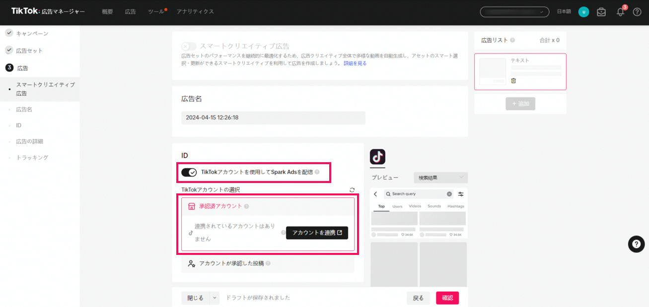広告設定画面のIDの[TikTokアカウントを使用してSpark Adsを配信]のトグルをオンにし、[承認済アカウント]を選択し、[アカウントを連携]をクリックします。