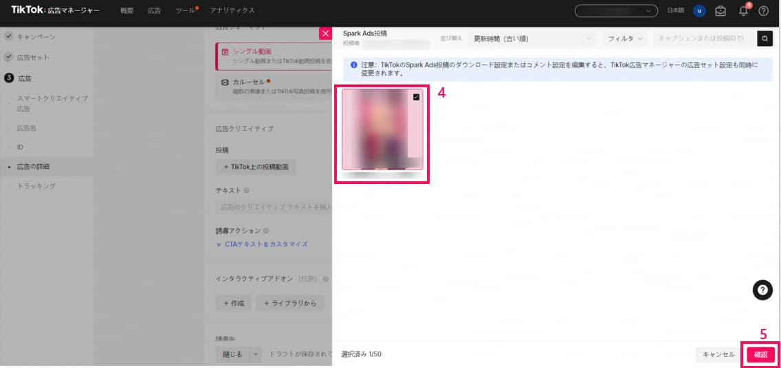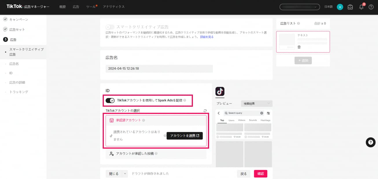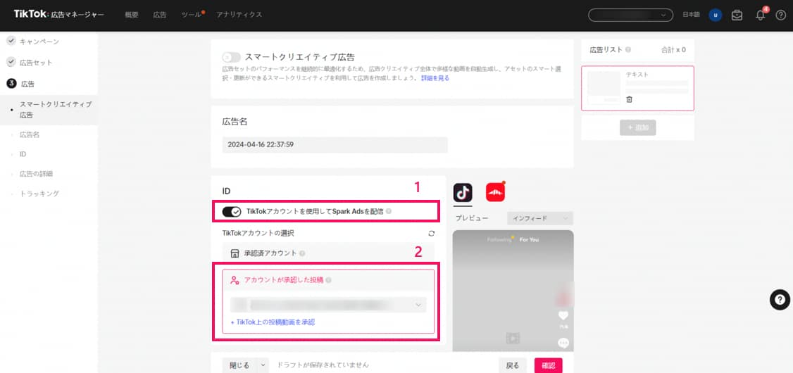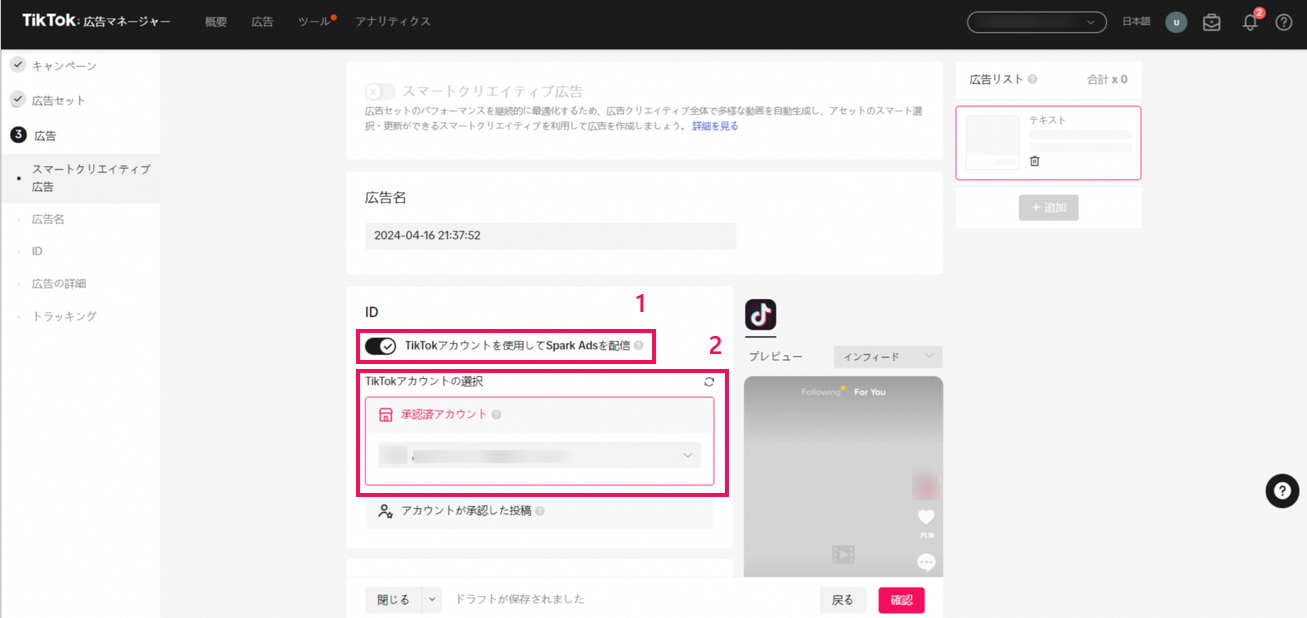 1.広告設定をIDの「TikTokアカウントを使用してSpark Adsを配信」のトグルをオン