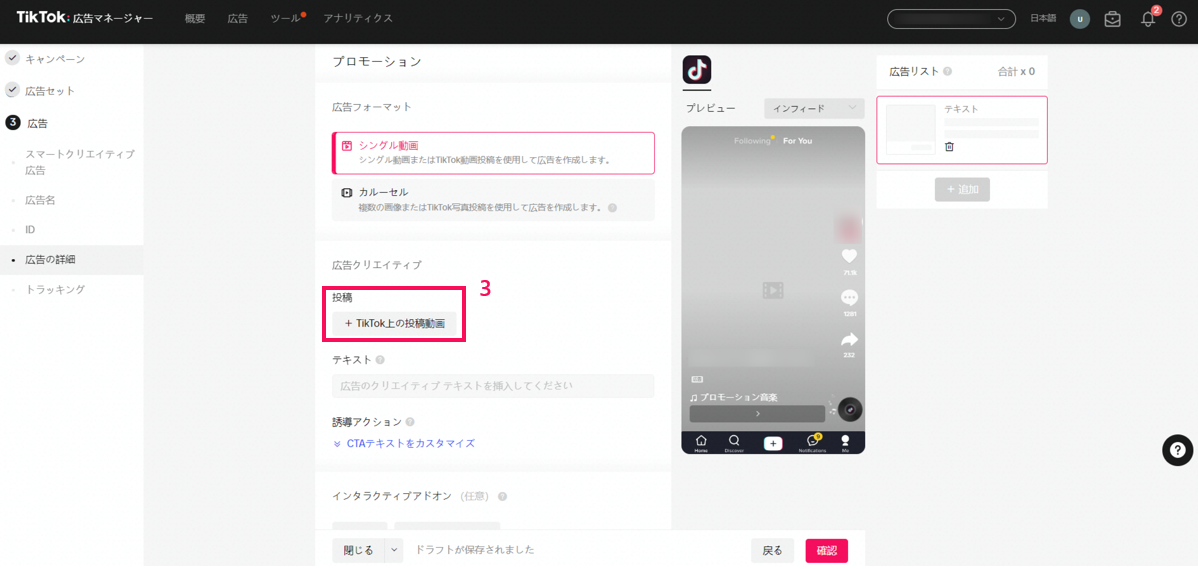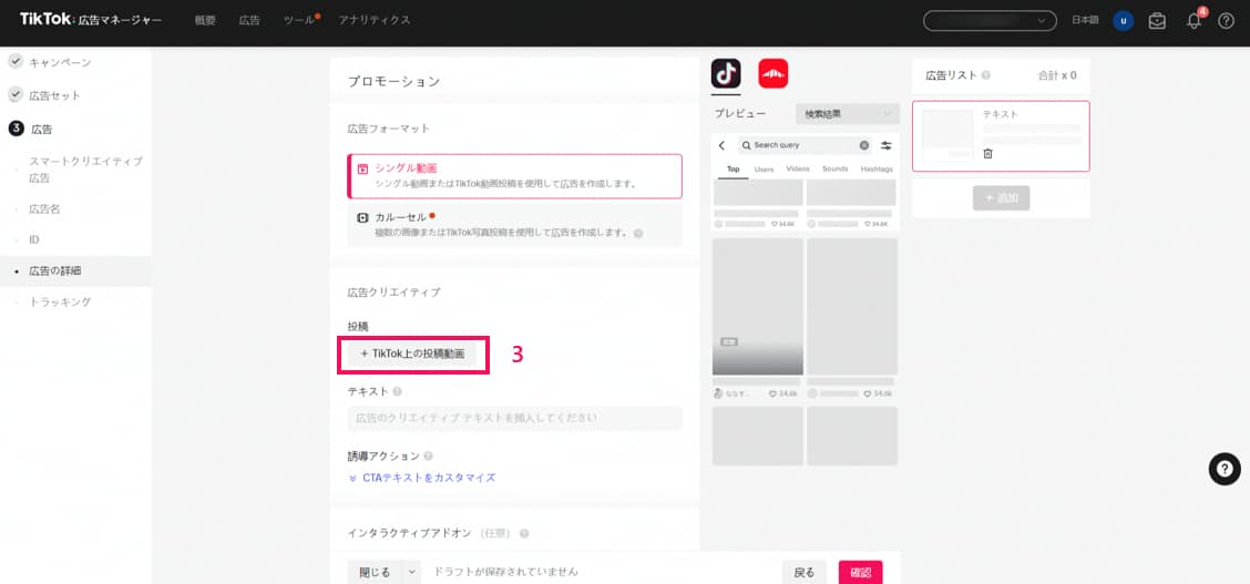 3.広告クリエイティブの[+TikTok上の投稿動画]をクリック