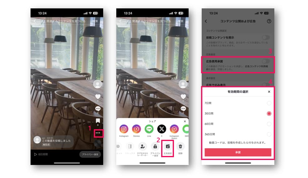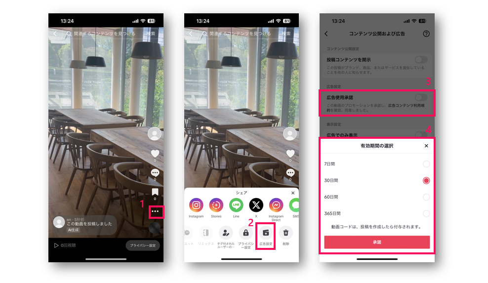 4.[有効期間の選択]のポップアップが立ち上がるため、広告利用の有効期間7日間・30日間・60日間・365日間から選択し[承諾]をタップ(期間は承諾確認後からカウントされます)