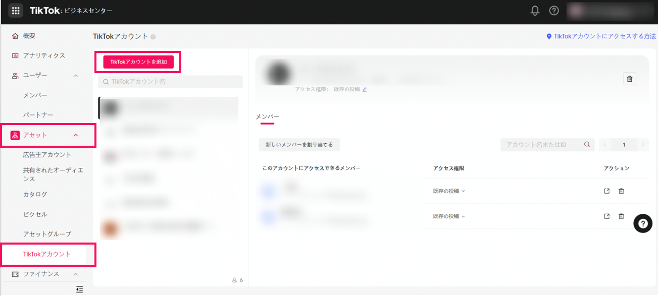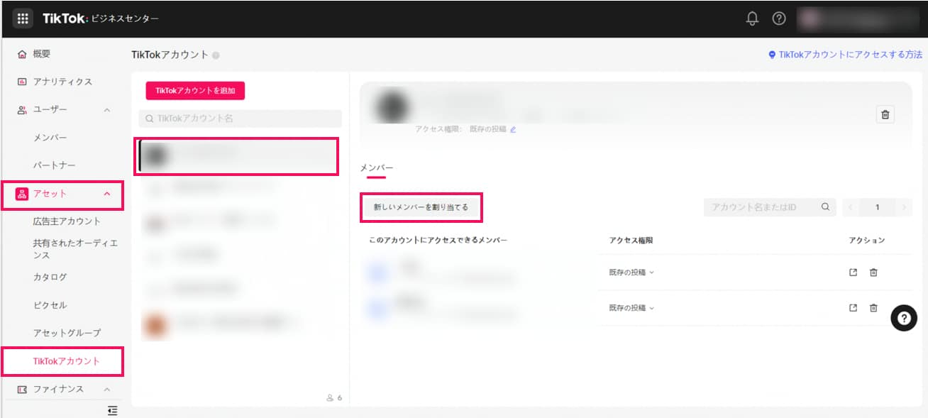 TikTokビジネスセンターを開きます。[アセット]の[TikTokアカウント]をクリックし、メンバーを割り当てたいTikTokアカウントを選択後、[新しいメンバーを割り当てる]をクリックします。