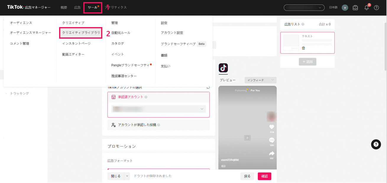 TikTokアカウントの広告利用に関する設定を終えたら、広告マネージャーのクリエイティブライブラリに動画を追加します。