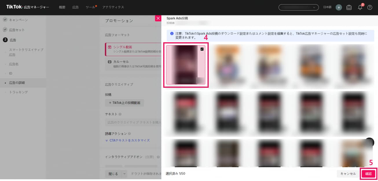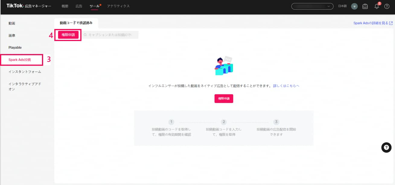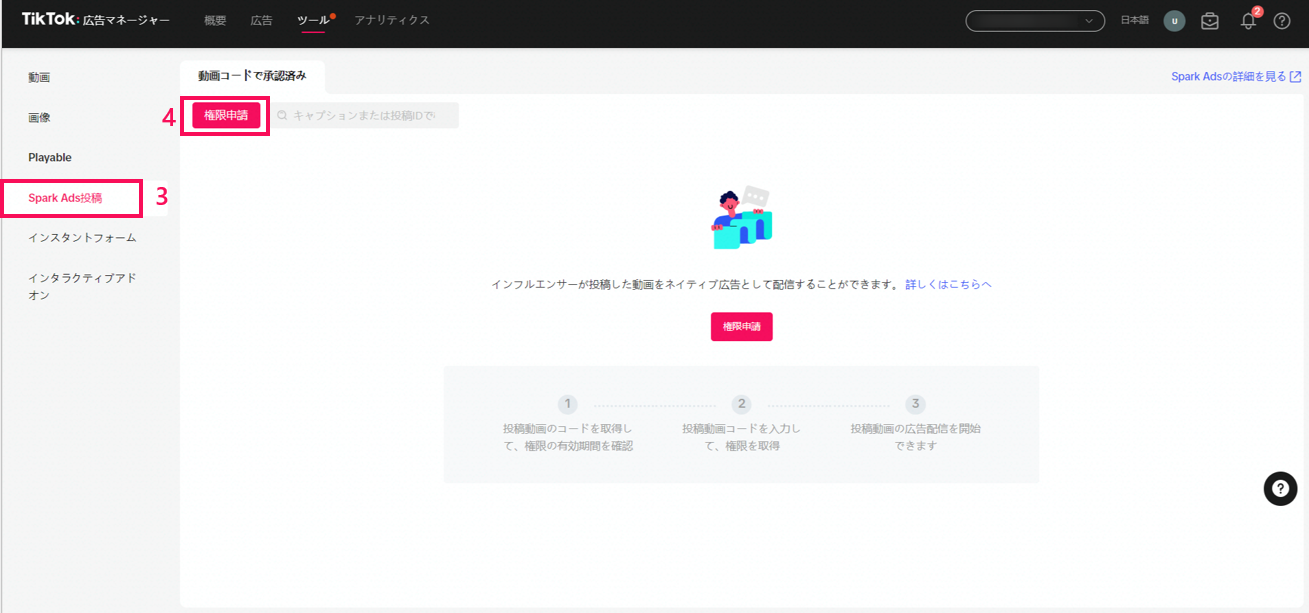 一般ユーザーを含むクリエイターが投稿した動画をSpark Adsに利用したい場合は、この方法で設定してください。