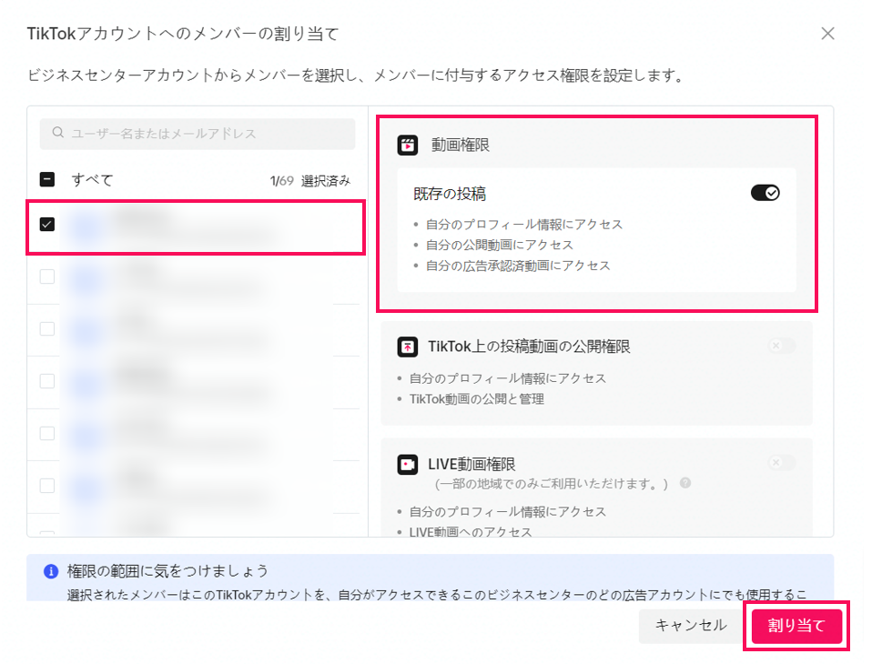 アクセス権限を付与したいユーザーにチェックを入れ、「動画権限」のスクロールバーを右にドラッグして[割り当て]をクリックしてください。TikTokアカウントへのアクセス権限の付与が完了し、これでTikTokビジネスアカウントの投稿の広告利用が可能になりました。