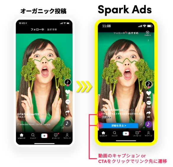 しかしSpark Adsを使えば、オーガニック動画にCTAボタンを追加して広告として配信できます。そのため、動画からシームレスにウェブサイトやアプリストアに誘導、アクションにつなげることが可能です。