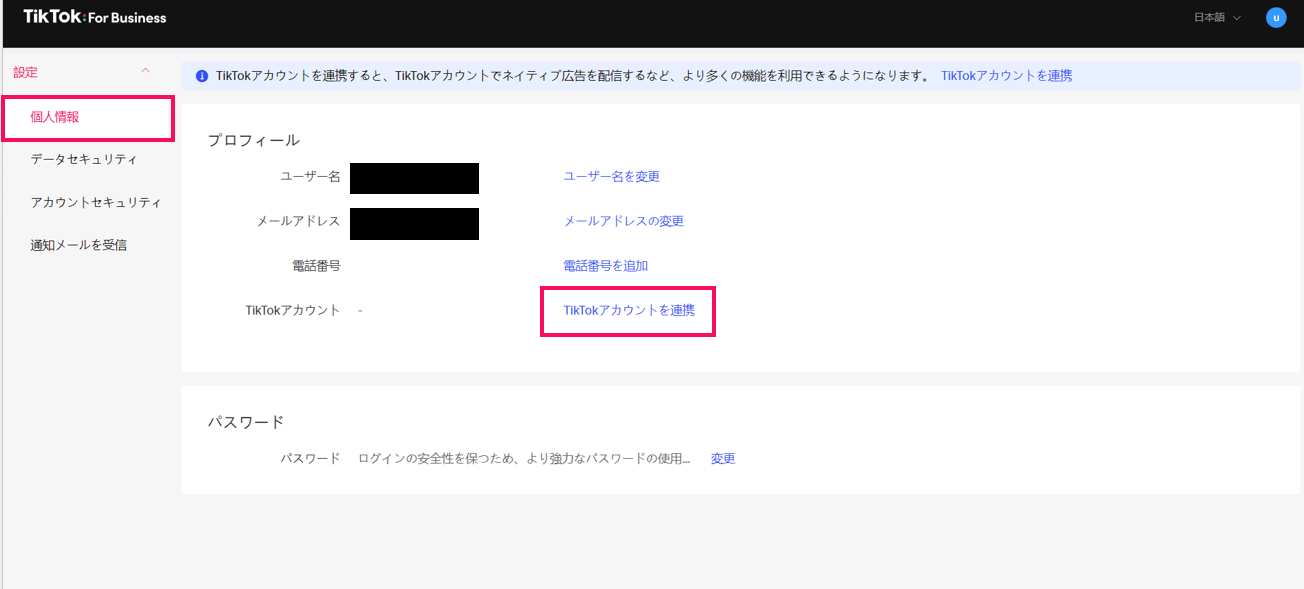 TikTokビジネスセンターを持っておらず、インハウス運用など、TikTokビジネスアカウントと広告アカウントの所有者が同じ場合は、この方法が速くて簡単です。