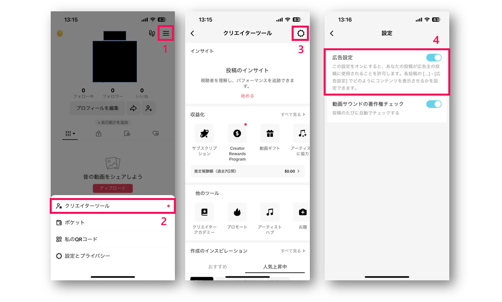 オーガニック投稿を利用したいクリエイターのTikTokアカウントでの広告設定の許可