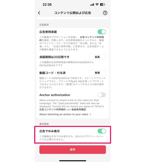 デフォルトではオフになっていますが、クリエイターなどアカウントの世界観を表現する動画と広告で使用する動画を分けたい(広告に使う動画をプロフィールに表示させたくない)場合はオンにするとよいでしょう。